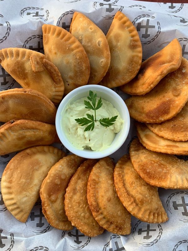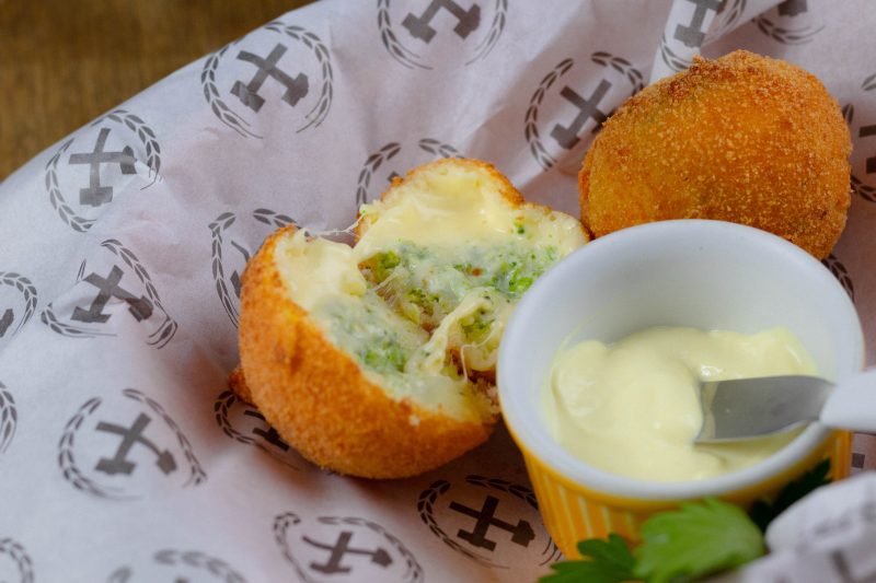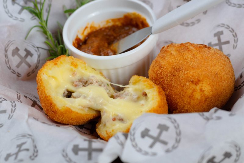 Bolinho de queijo frito, recheado com com linguiça campeira.