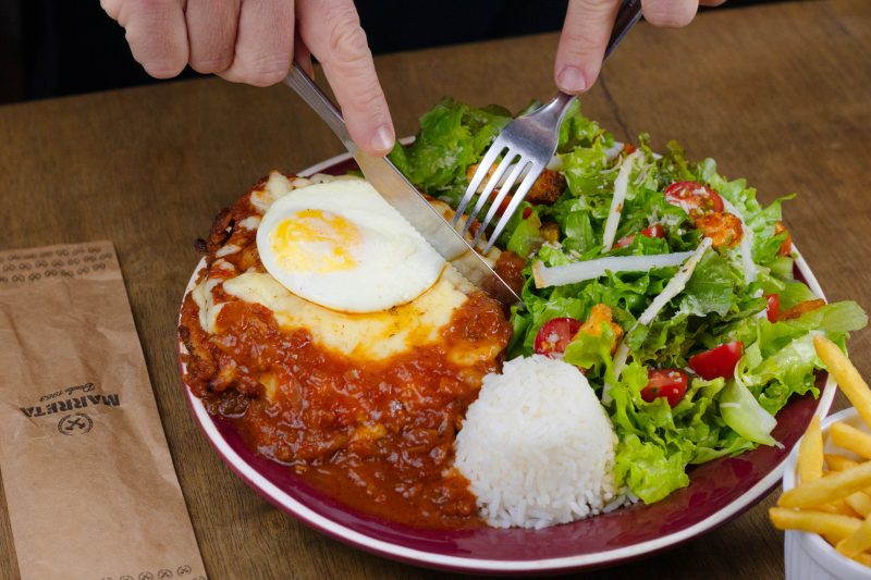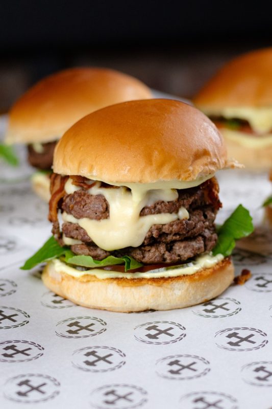 Pão de manteiga, bife, american cheese, maionese Marreta, bacon, rúcula, tomate e picles.