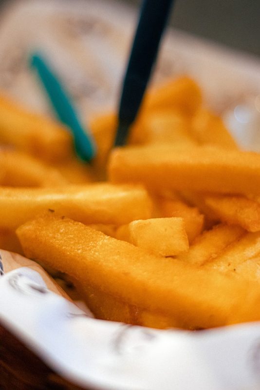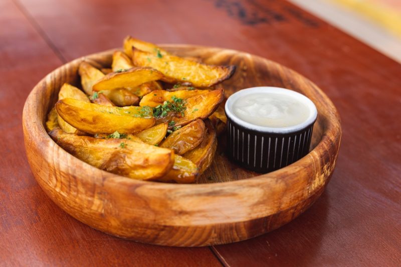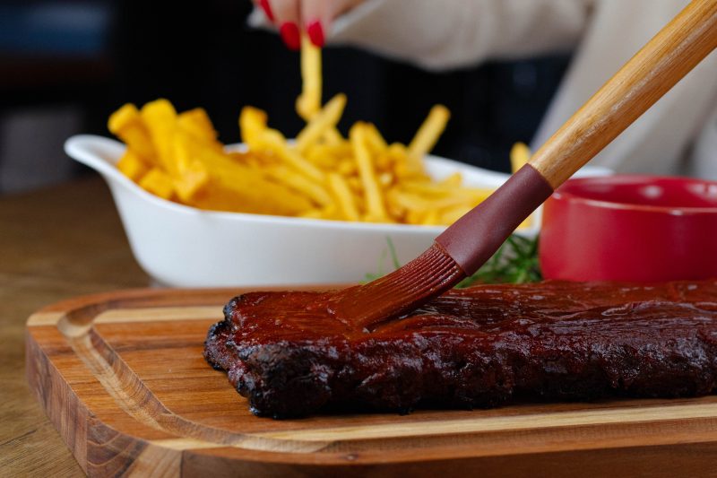 Tira de costela suína assada, pincelada com molho barbecue, acompanhada de fritas.