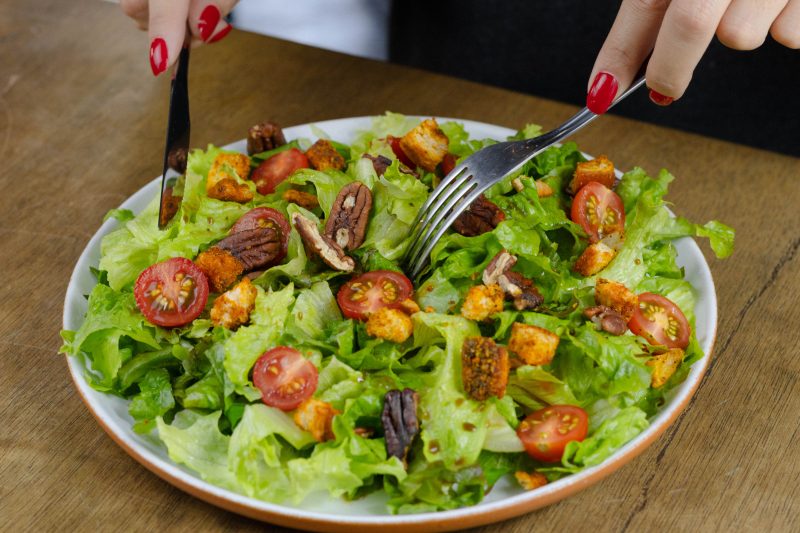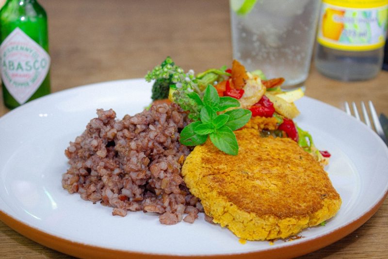 Legumes e vegetais salteados com azeite de oliva, arroz vermelho integral e bife de grão de bico.