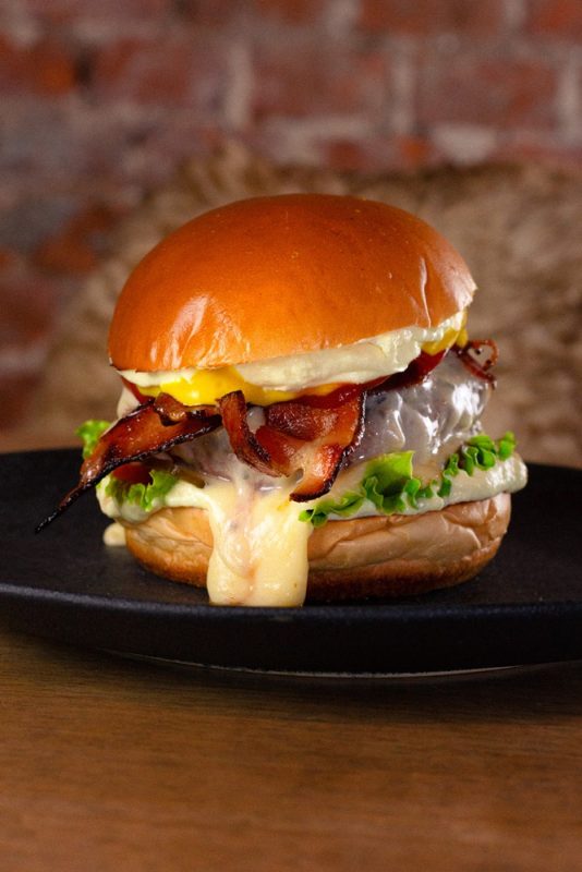 Bife de 160g, pão de manteiga, american cheese , bacon, ovo, maionese Marreta, rúcula, tomate e picles.