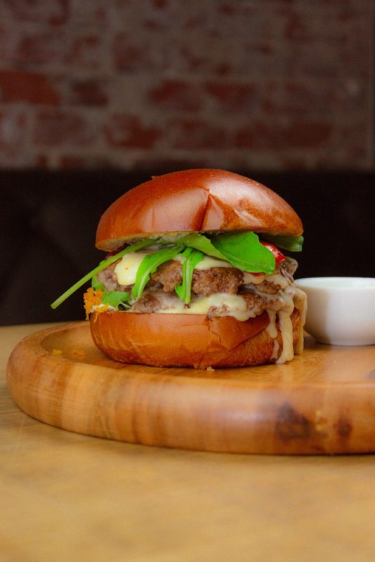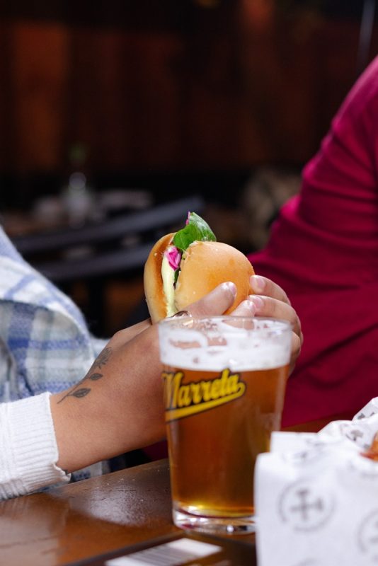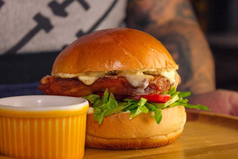 Bife de grão de bico, pão de manteiga, maionese Marreta, american cheese, rúcula, tomate, picles e cebola caramelizada.