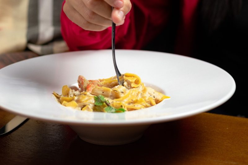 Massa Fettucine artesanal coberta com molho a base de parmesão com pedaços de bacon.