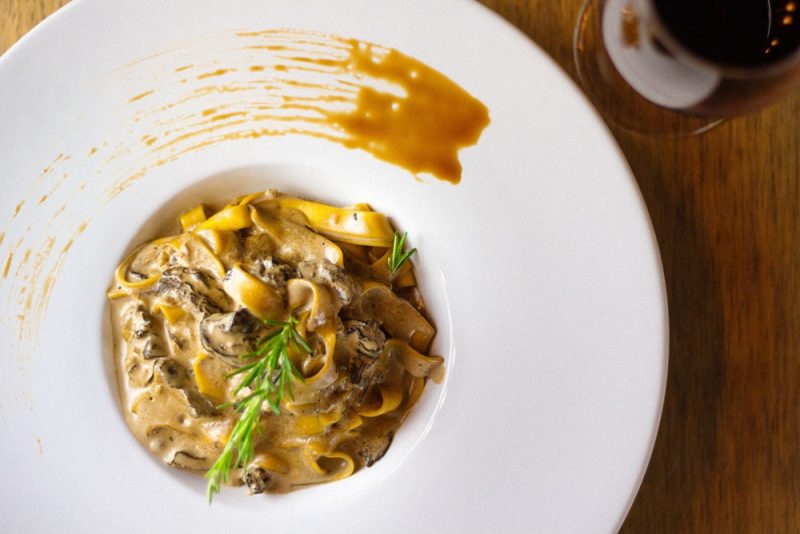 Massa Fettucine artesanal, coberta com molho de cogumelo funghi ao vinho.