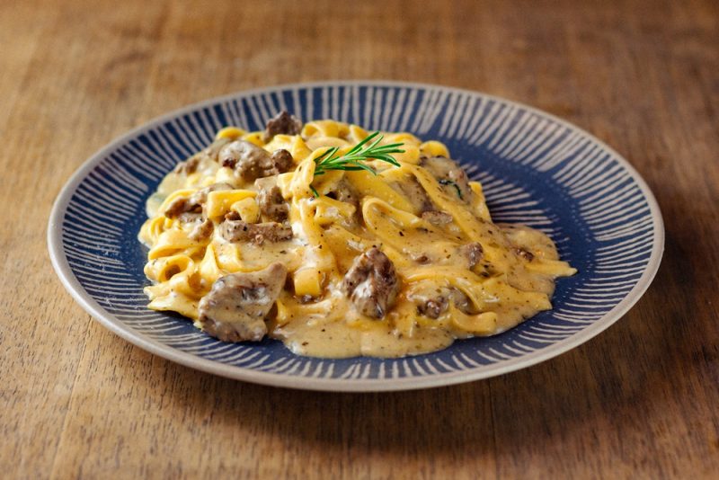 Massa Fettucine artesanal com iscas de filé mignon coberta com molho a base de parmesão.