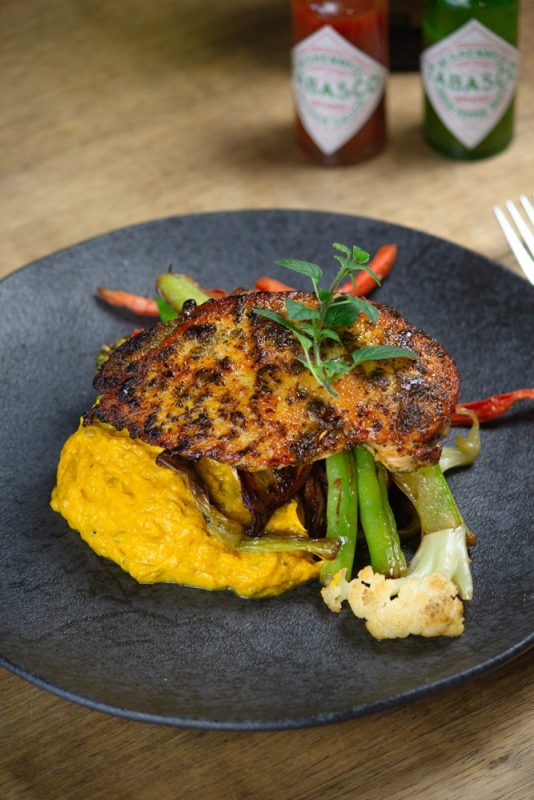 Peito de frango grelhado, legumes e vegetais salteados e purê de abóbora.