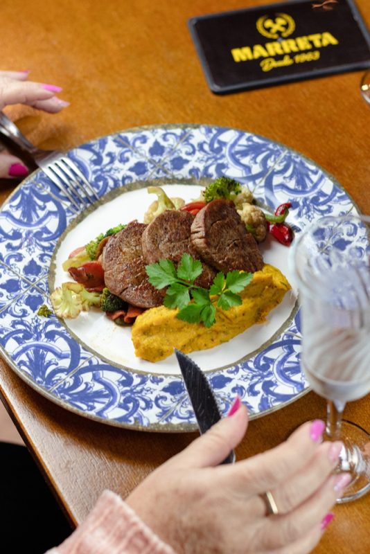Filé Mignon grelhado, legumes e vegetais salteados e purê de abóbora.