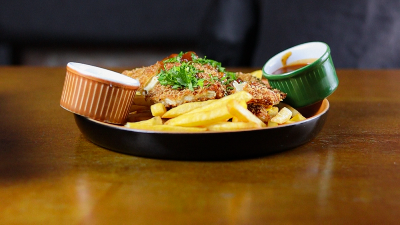 Filé de peito de frango empanado, temperado com ervas-finas e limão