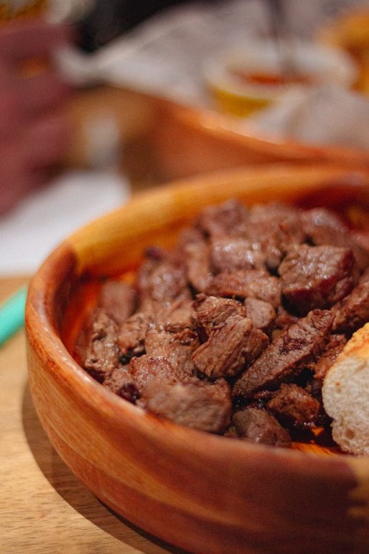 Filé mignon grelhado na chapa, acompanhado de torradinhas.