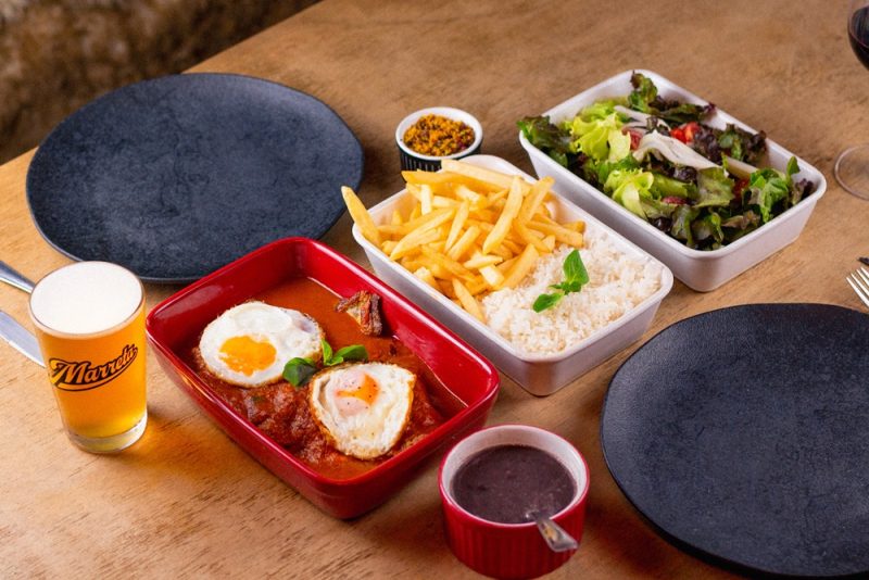 Pão de manteiga, bife, tomate seco, farofa Marreta, american cheese, maionese Marreta, rúcula e picles.
