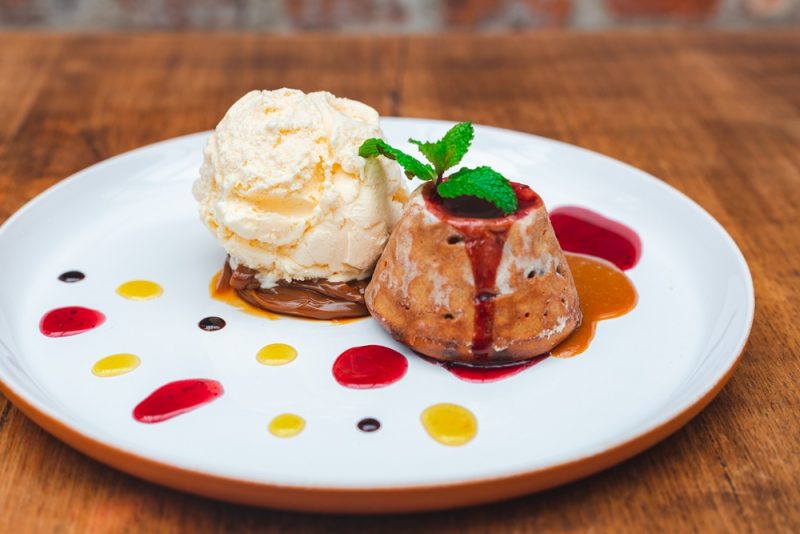 Pequeno bolo quente de doce de leite, acompanhado de sorvete de creme e doce de leite.