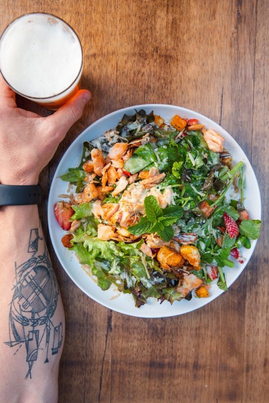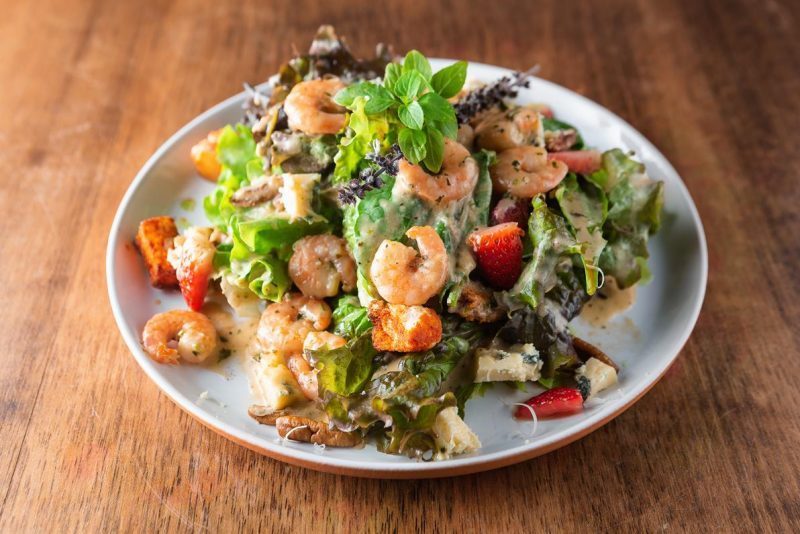 Seleção de folhas, molho especial, morangos, crótons, nozes, lascas de gorgonzola e parmesão