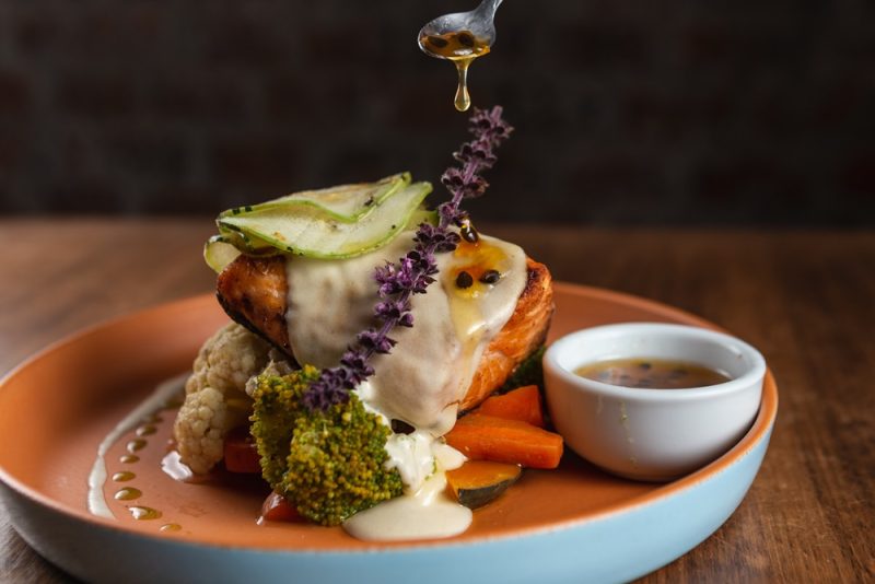 Camarão / salmão grelhado com azeite de oliva, legumes e vegetais salteados e purê de abóbora.